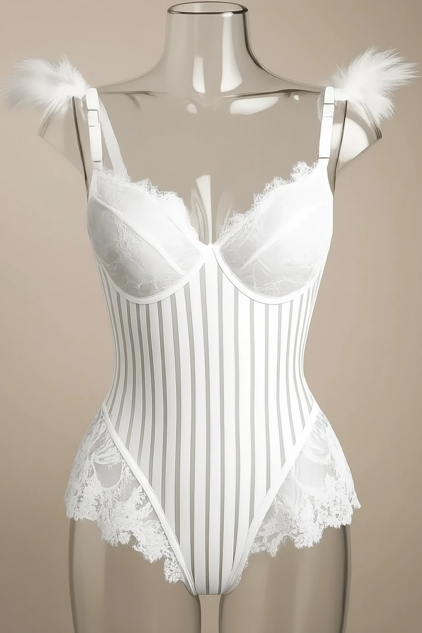 این بادی فانتزی خاص و لوکس با ترکیب پارچه لطیف راهراه و گیپور در قسمت کاپ و دور ران، جلوهای بسیار زنانه و مدرن دارد. روی شانهها با پرهای ظریف تزیین شده و زنجیرهای طلایی صدفی از بازو تا شانه نمایی بسیار متفاوت و چشمگیر خلق کرده است. فرم کاپ سینه فنردار، به همراه برش هفت عمیق و خطوط عمودی باعث فرمدهی زیبا به اندام میشود. برای دیدن عکس تنخور اینجا کلیک کنید