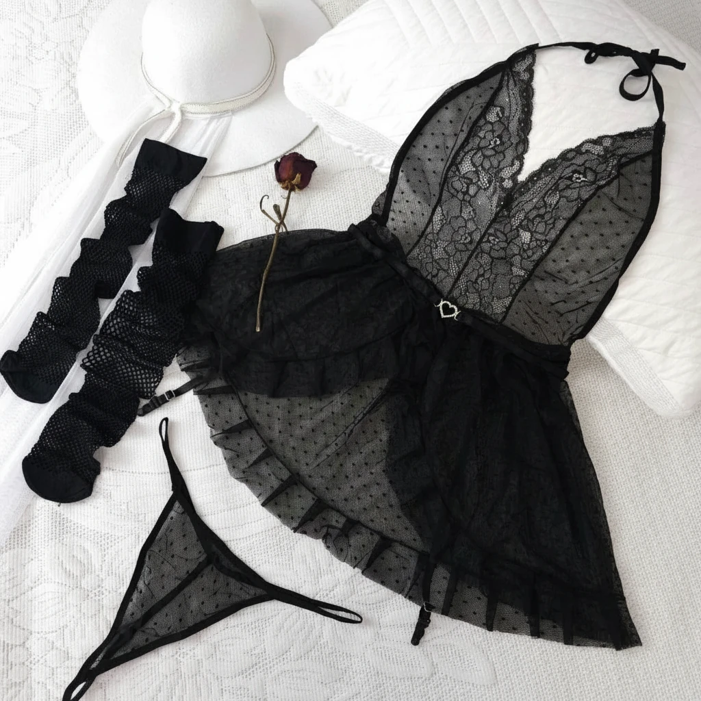 لباس خواب زنانه فانتزی جورابدار مدل پشت باز با تور خالدار نازک کد 3212