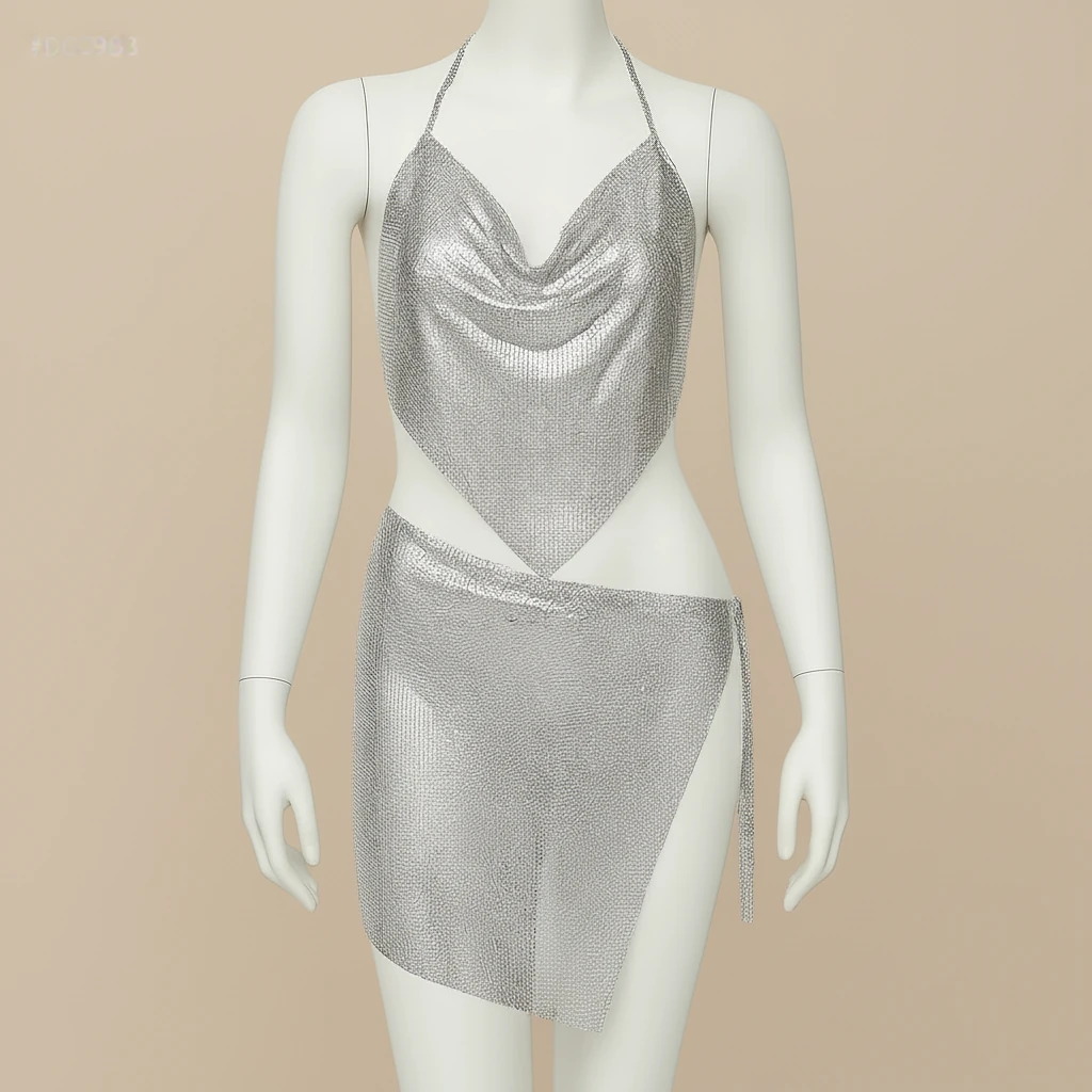 مدل تاپ : دکلته آزاد پشت باز، بند پشت سینه و دور گردن زنجیری رگلاژدار، پایین تاپ برش مثلثی