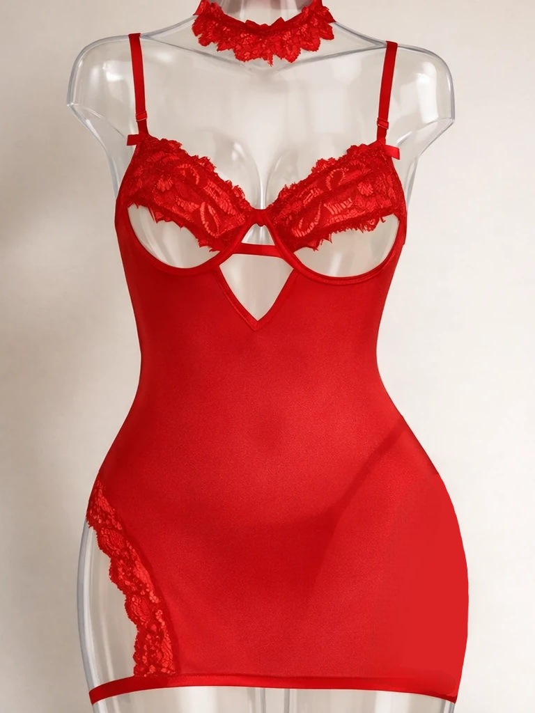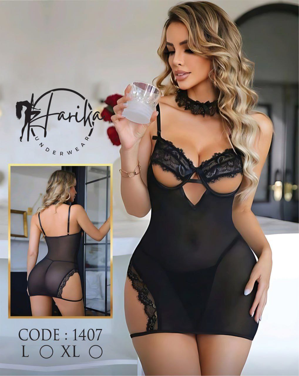 لباس خواب زنانه فانتزی فنردار توری گیپوری مدل سینه باز کد 1407